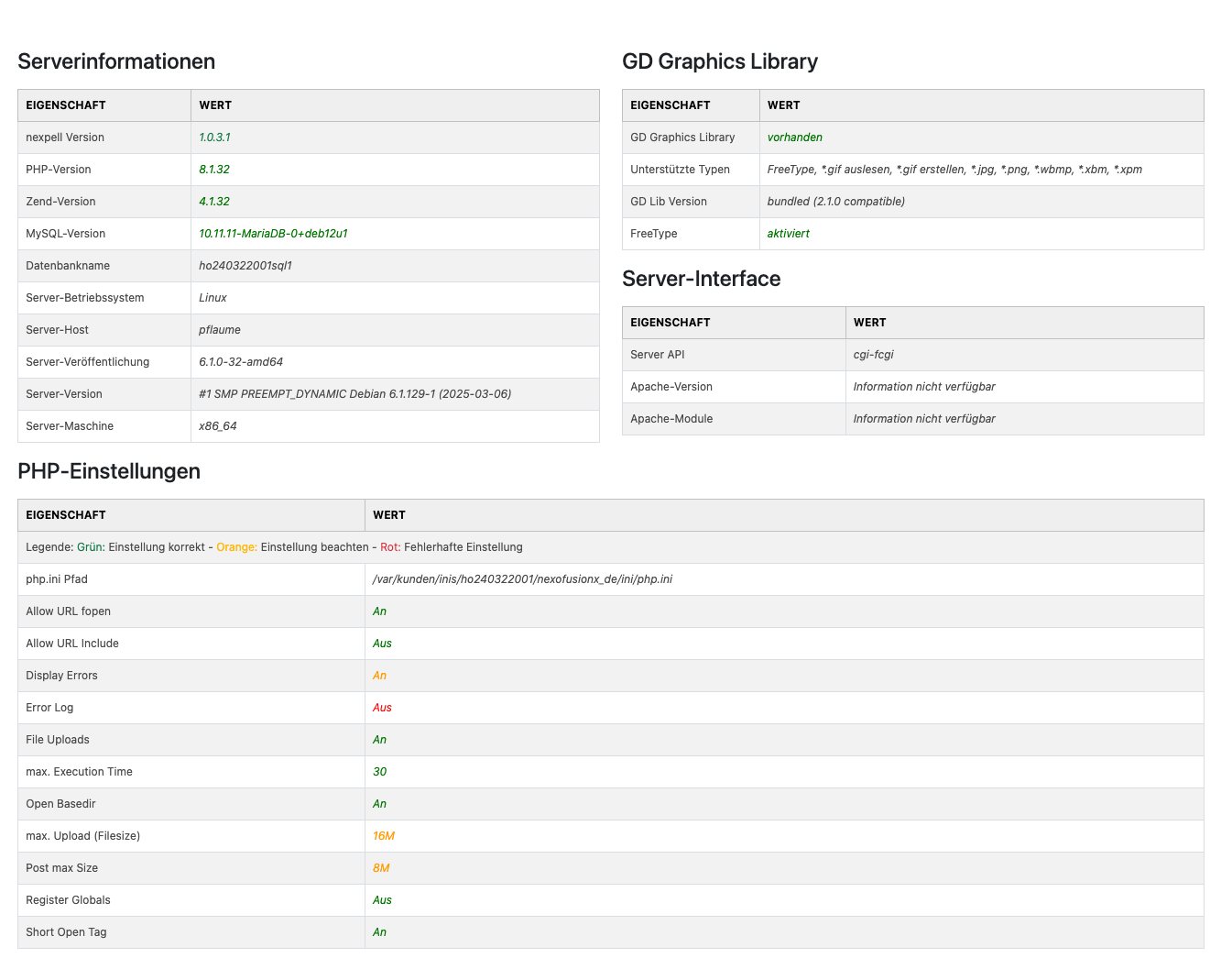 Bitte geh einmal in das Admincenter unter der Rubrik "System & Einstellungen" und auf die Untergruppe "Webserver-Info."